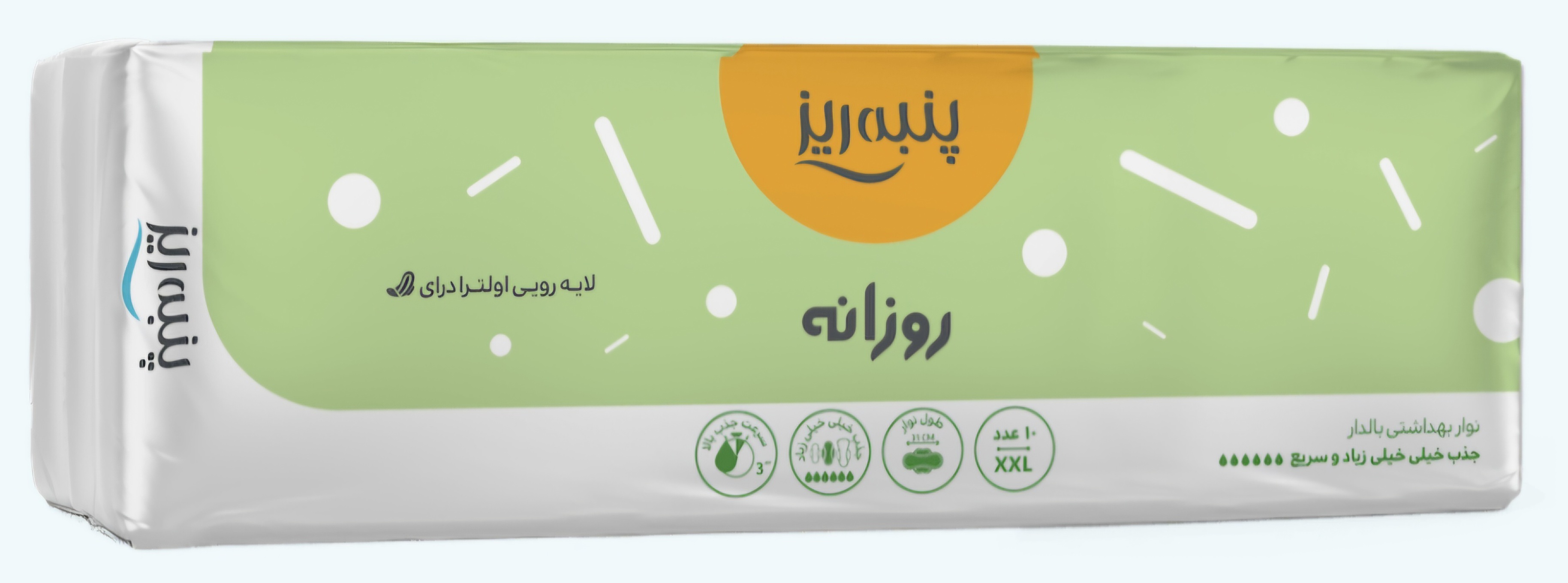 ویژگیها:مناسب برای خونریزی شدیدابعاد:mm 310*105*8تعداد :بسته 10 تایی لایه رویی: مشبک قدرت جذب: خیلی خیلی زیاد و سریع