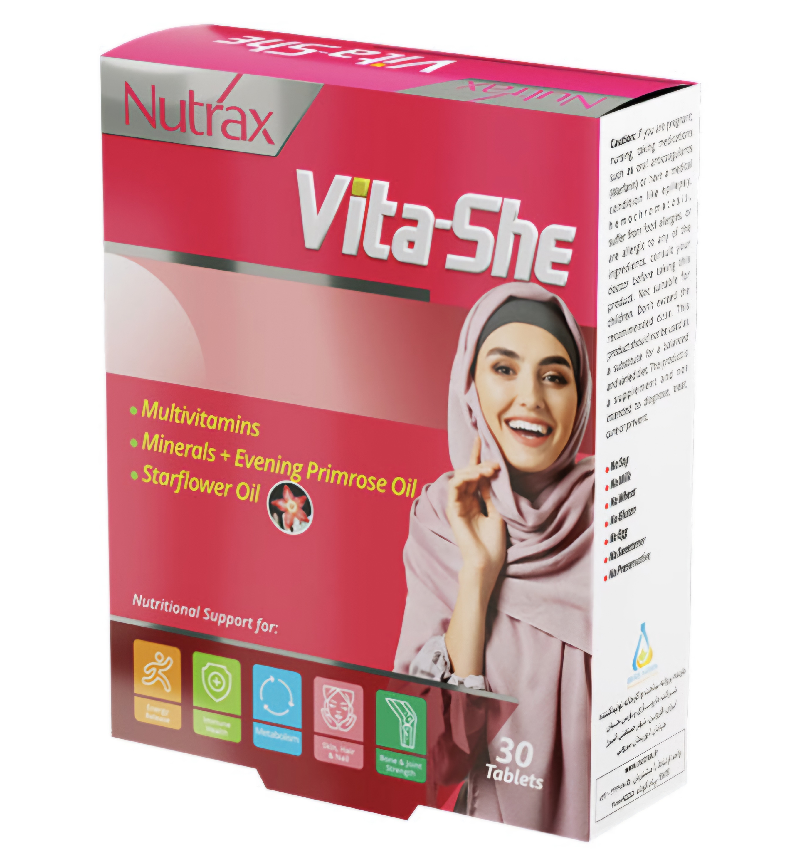 نوتراکس وایتا-شی، یک مولتی ویتامین و مینرال اختصاصی بانوان است که با ترکیبی از ویتامین ها، مواد معدنی و عصارههای گیاهی مانند گل مغربی و گل گاوزبان، به تامین نیازهای تغذیه ای روزانه کمک میکند. این محصول علاوه بر تقویت سیستم ایمنی به افزایش متابولیسم بدن و تولید انرژی کمک میکند. مکمل اختصاصی بانوان جهت تأمین نیاز روزانه بدن به ویتامین ها و املاح